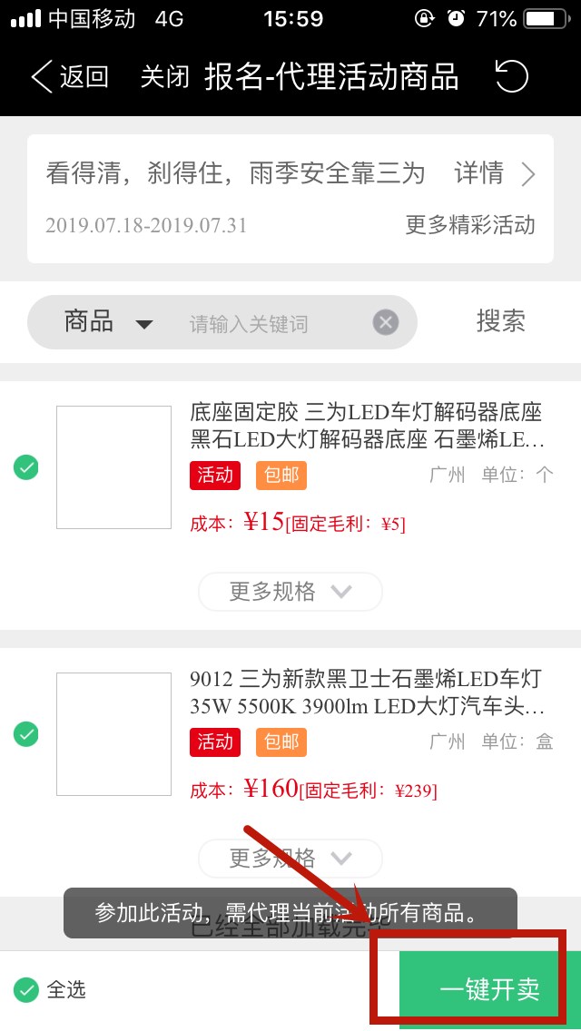 3、全選所有產(chǎn)品,點(diǎn)擊“一鍵開(kāi)賣(mài)”。