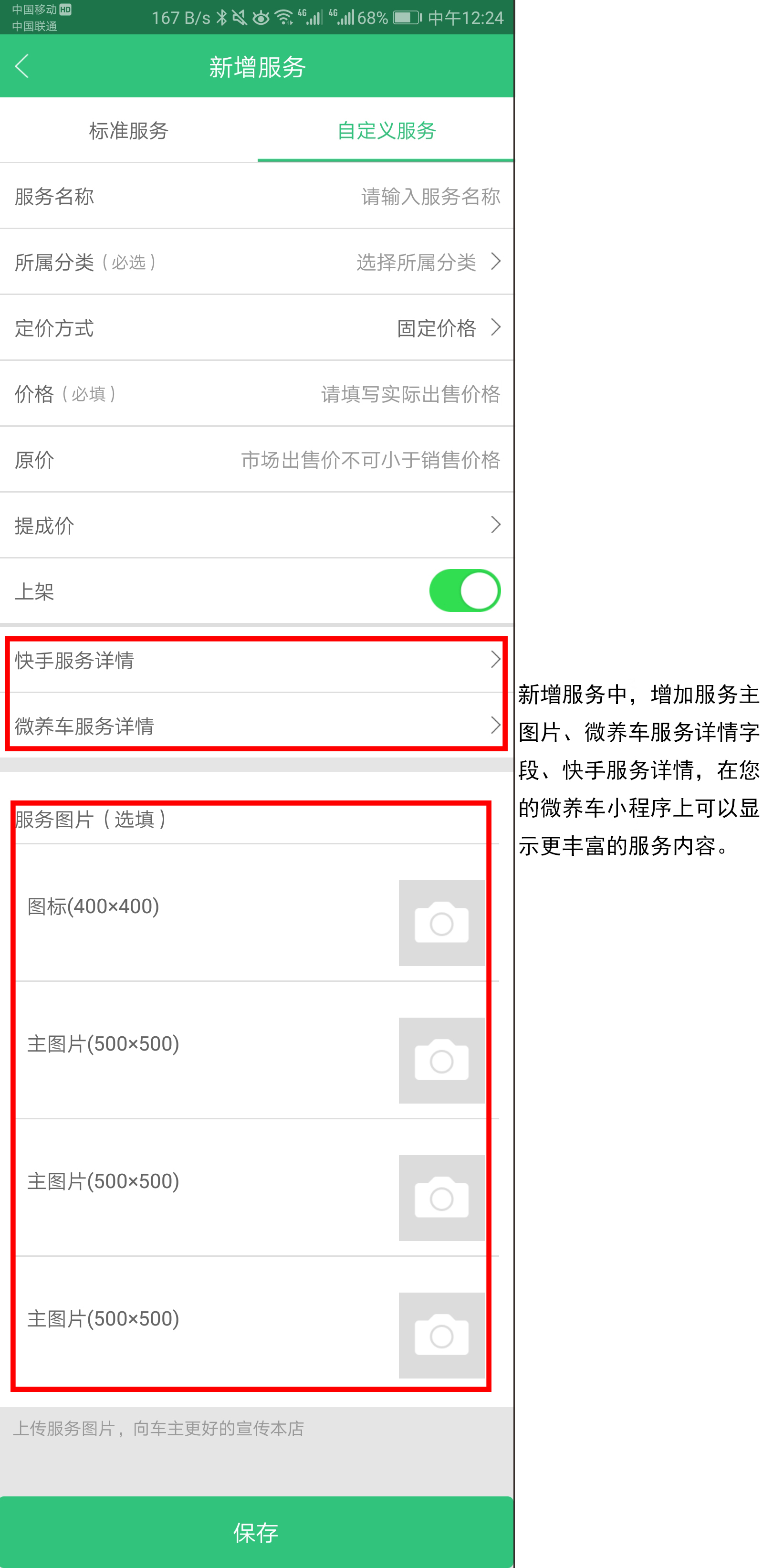 2.新增服務(wù)和服務(wù)編輯改版,在服務(wù)編輯時(shí),門(mén)店可加入服務(wù)主圖片、微養車(chē)服務(wù)詳情字段,讓您的微養車(chē)小程序在服務(wù)內容的展示上變得更加豐富!
