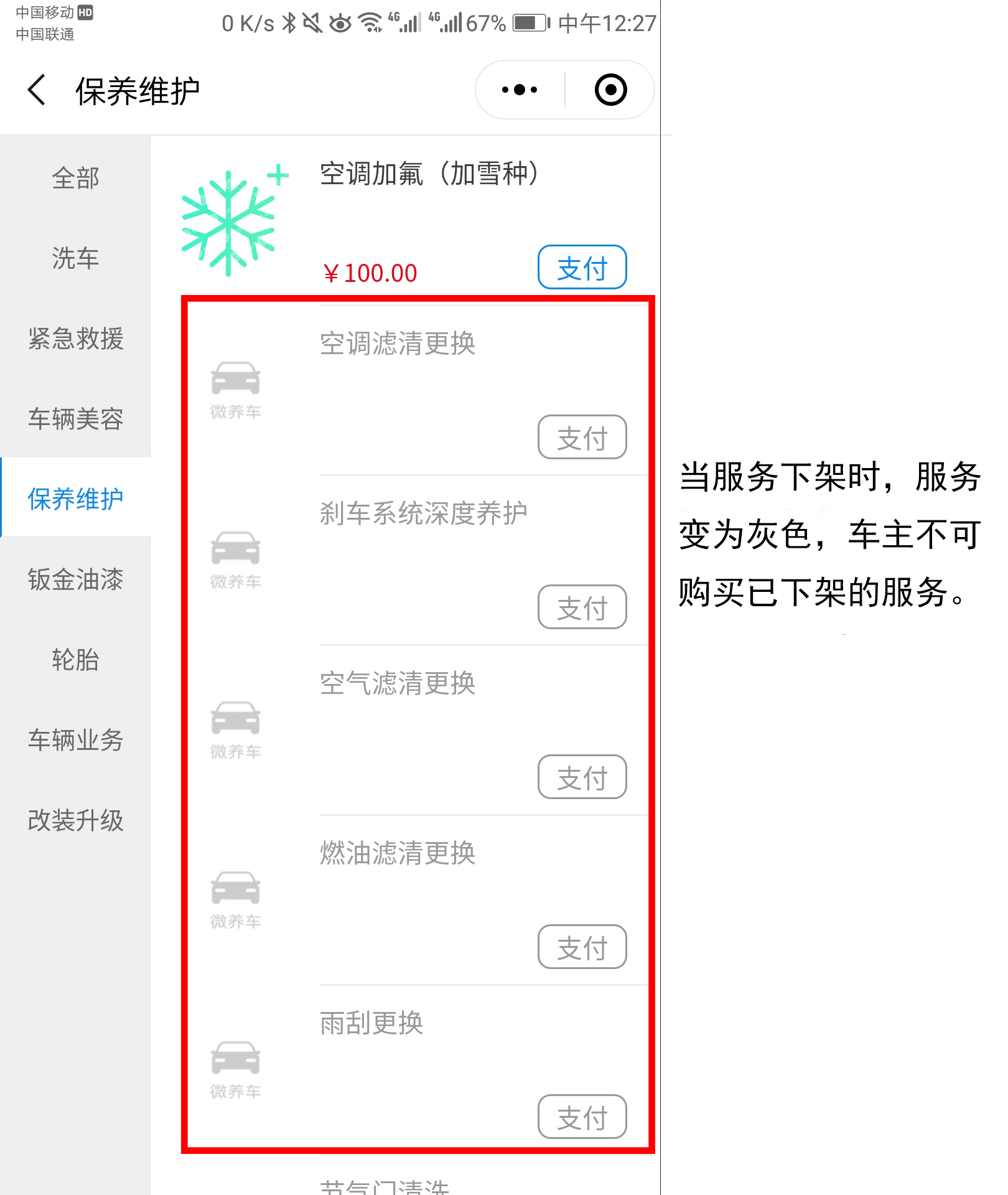 3.當服務(wù)下架時(shí),呈現給車(chē)主的是灰色的服務(wù)名稱(chēng),且車(chē)主不可購買(mǎi)已下架的服務(wù)。