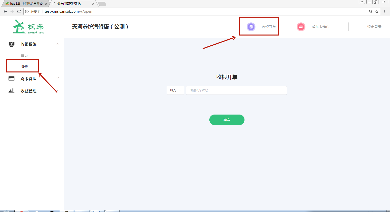 1、點(diǎn)擊左邊“收銀系統”模塊,再點(diǎn)擊其下拉菜單子“收銀”;或者點(diǎn)擊系統右上角“收銀開(kāi)單”。