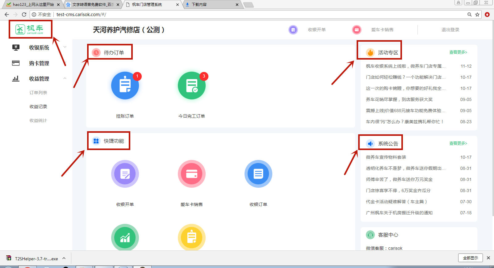 1、在首頁(yè)界面可直接看到待辦訂單、各個(gè)快捷功能,右邊顯示最新活動(dòng)及系統公告。若在其他界面,只需點(diǎn)擊左上角“楓車(chē)”LOGO,即可跳轉回首頁(yè)。