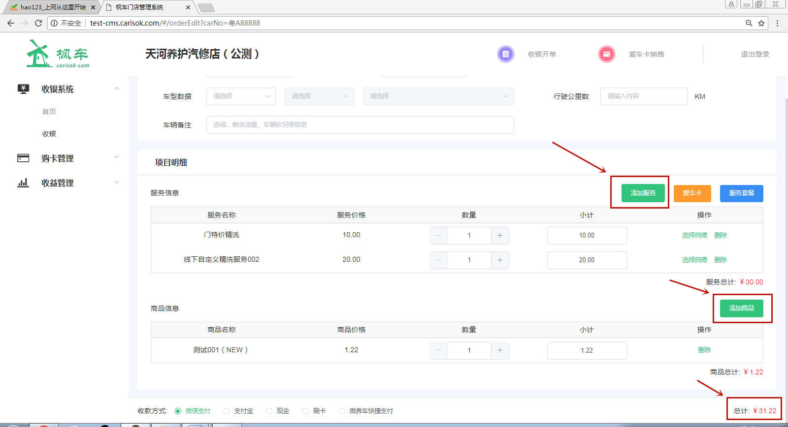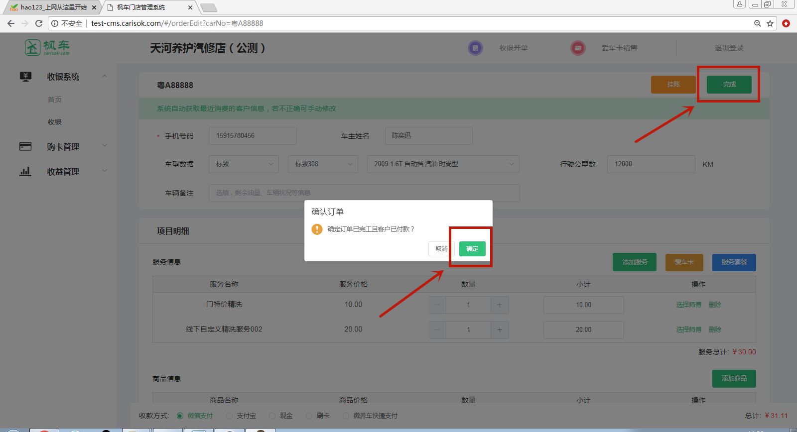 2、輸入車(chē)牌號,進(jìn)入“收銀”頁(yè)面,填寫(xiě)客戶(hù)信息,勾選車(chē)主的服務(wù)及商品,系統自動(dòng)生成總價(jià)格。
