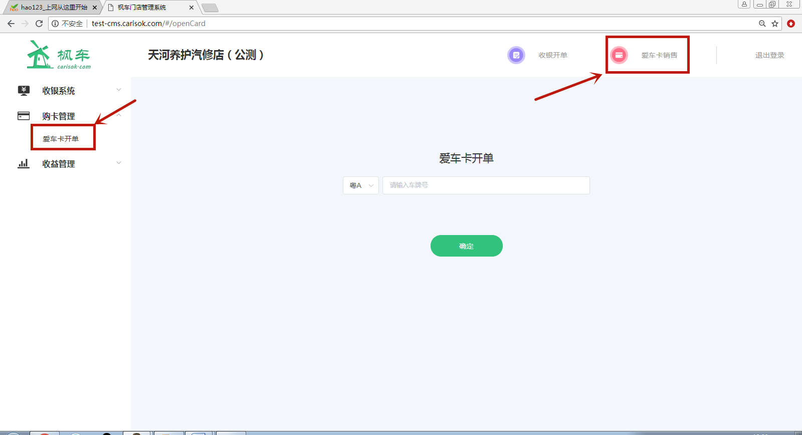 1、點(diǎn)擊左邊“購卡管理”模塊,再點(diǎn)擊其下拉菜單子“愛(ài)車(chē)卡開(kāi)單”;或者點(diǎn)擊系統右上角“愛(ài)車(chē)卡銷(xiāo)售”。