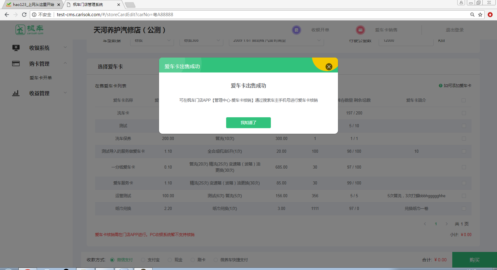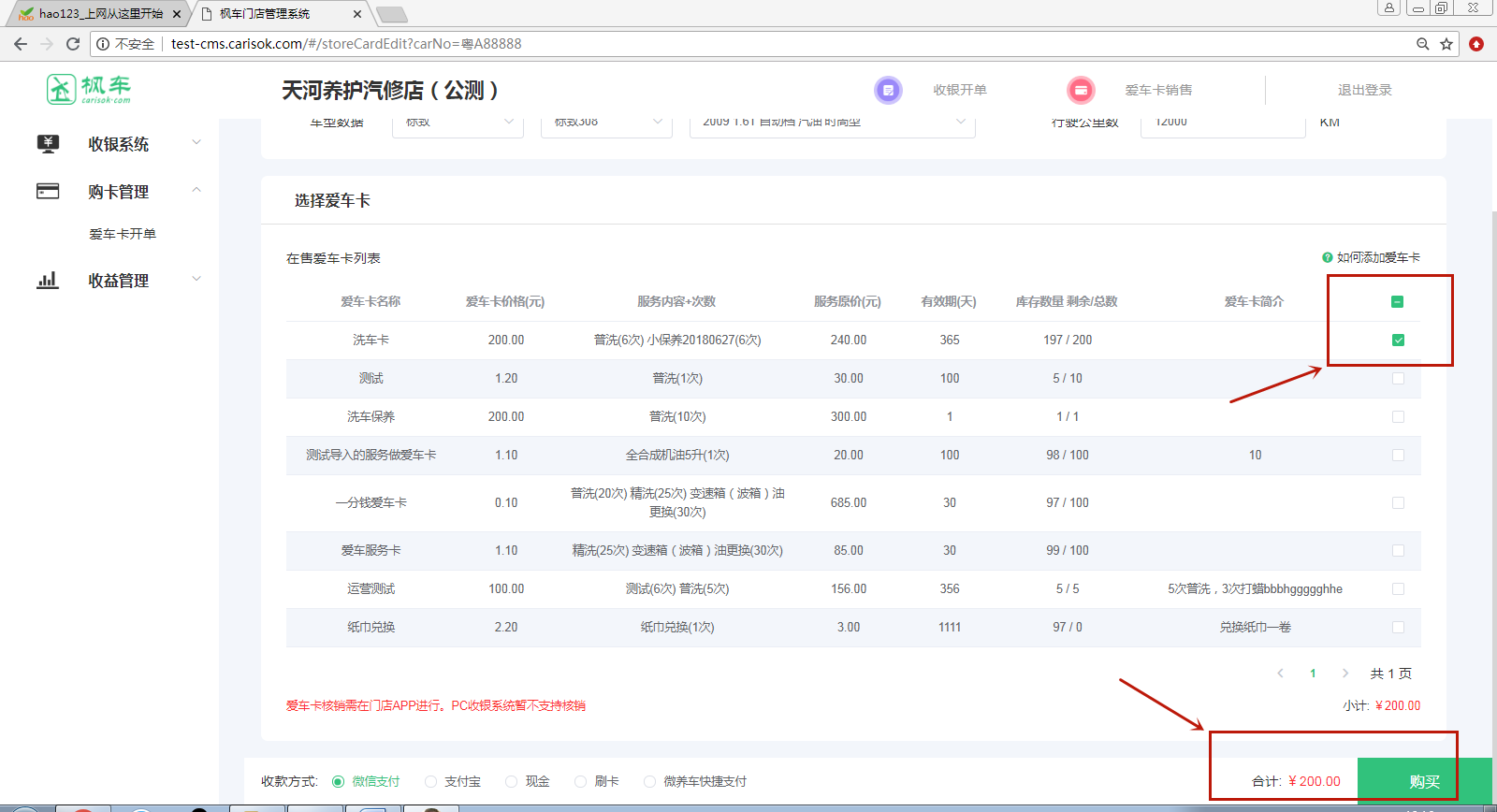 3、門(mén)店可在頁(yè)面下方選擇支付方式??蛻?hù)在線(xiàn)下支付后,再點(diǎn)擊“購買(mǎi)”,愛(ài)車(chē)卡即出售成功。