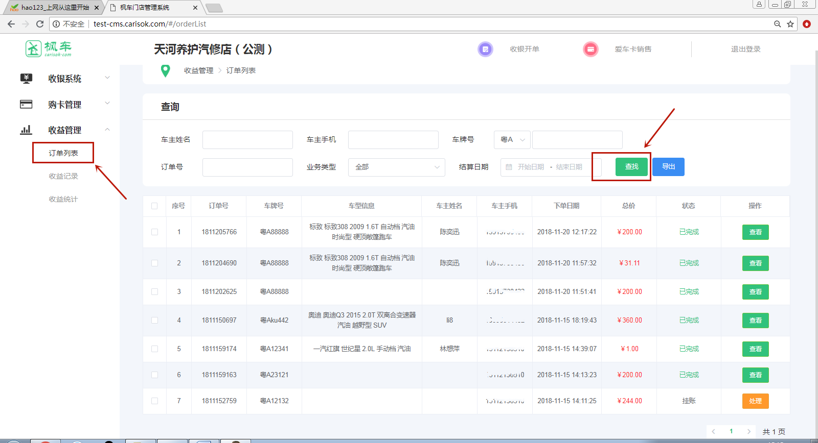 1、點(diǎn)擊左邊“收益管理”模塊,再點(diǎn)擊其下拉菜單子“訂單列表”,即可看到最近的訂單情況,同時(shí)支持車(chē)主信息、訂單號、業(yè)務(wù)種類(lèi)、結算日期查找。