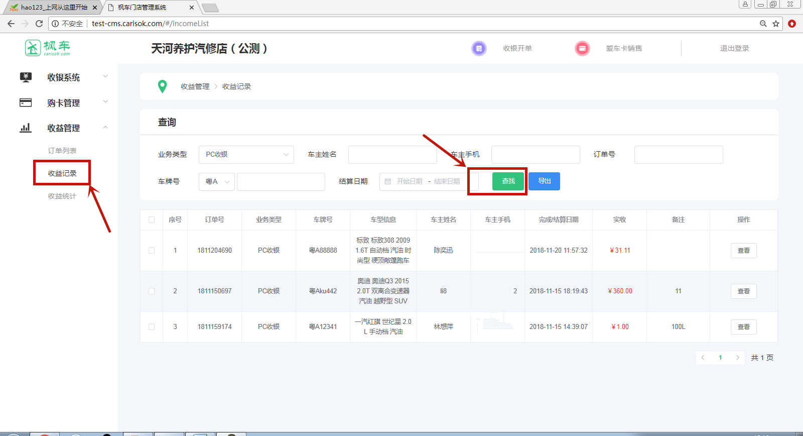 2、點(diǎn)擊左邊“收益管理”模塊,再點(diǎn)擊其下拉菜單子“收益記錄”,即可看到最近的收益情況,同時(shí)支持業(yè)務(wù)類(lèi)型、車(chē)主信息、結算日期查找。點(diǎn)擊左邊“收益管理”模塊,再點(diǎn)擊其下拉菜單子“收益記錄”,即可看到最近的收益情況,同時(shí)支持業(yè)務(wù)類(lèi)型、車(chē)主信息、結算日期查找。