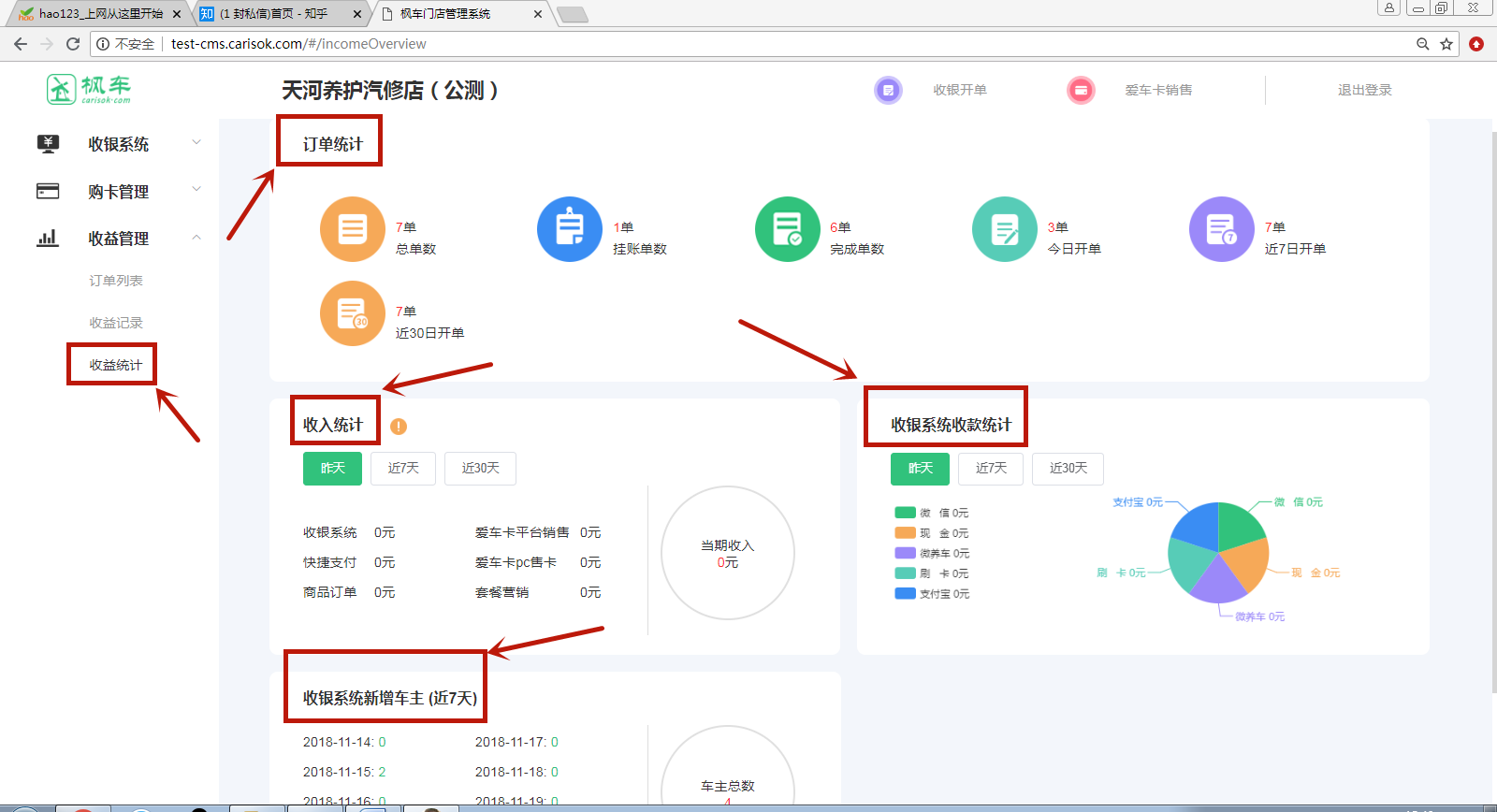 3、點(diǎn)擊左邊“收益管理”模塊,再點(diǎn)擊其下拉菜單子“收益統計”,可在界面查看到訂單數量、收入情況、收款情況、新增車(chē)主的數據信息。