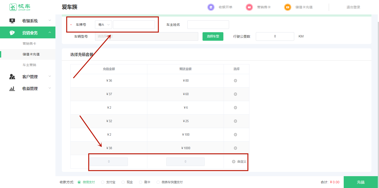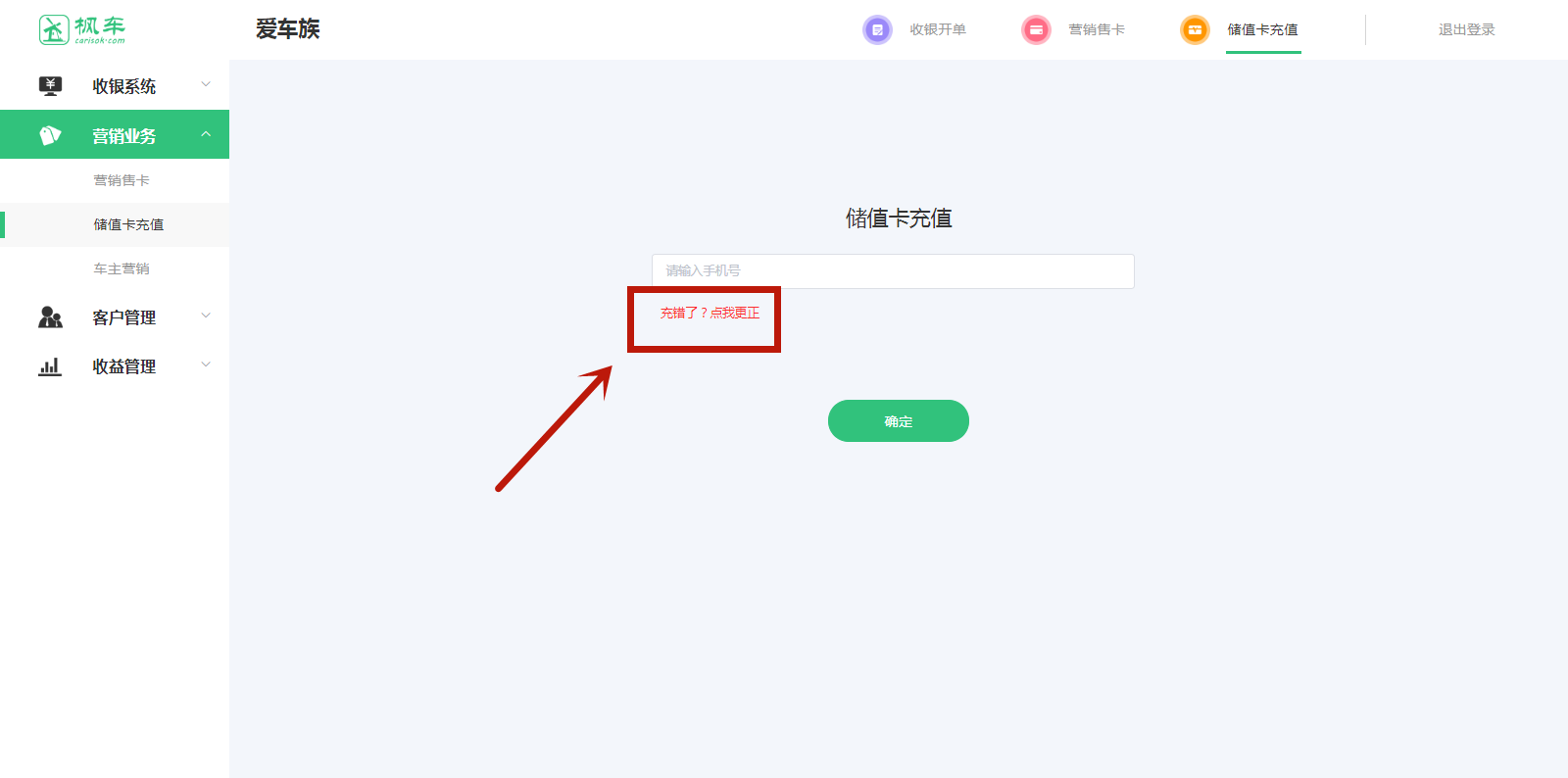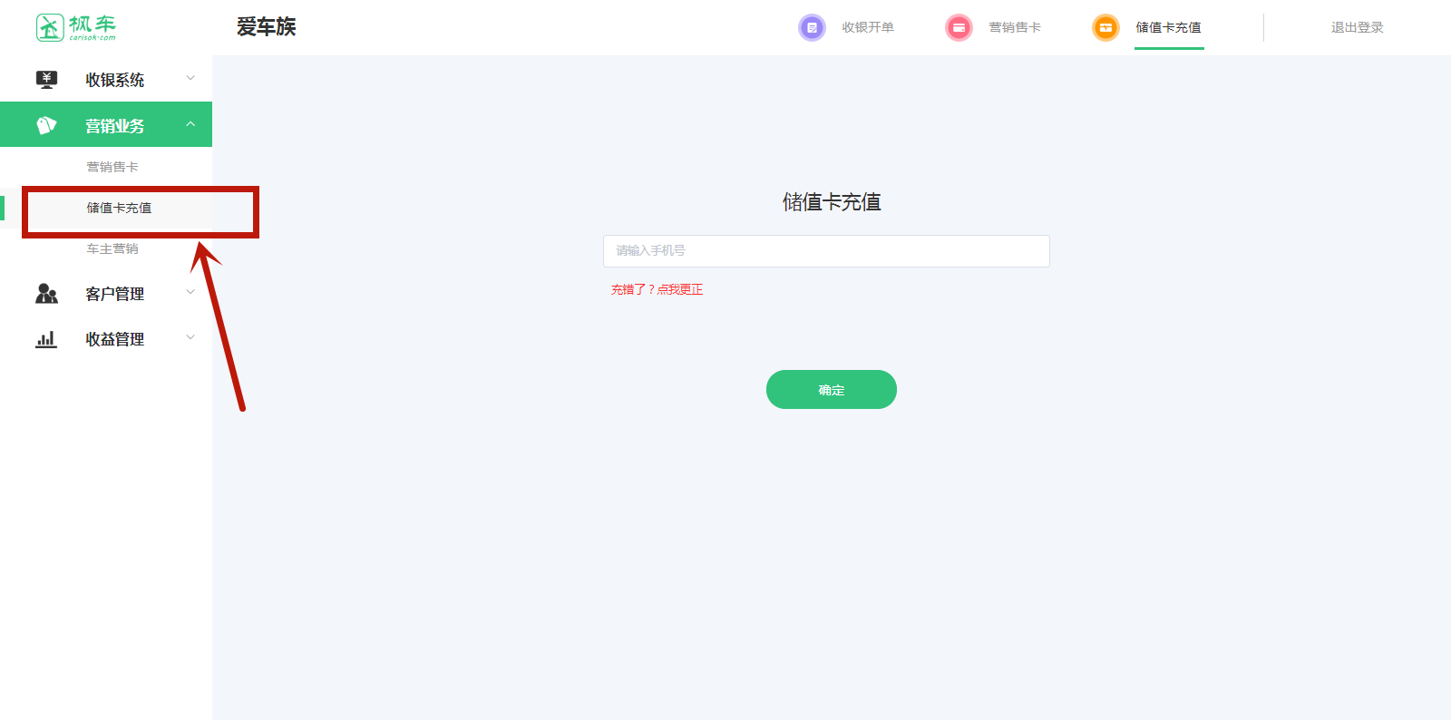 1、進(jìn)入楓車(chē)門(mén)店電腦版,在“營(yíng)銷(xiāo)業(yè)務(wù)”中找到“儲值卡充值”,點(diǎn)擊儲值卡充值進(jìn)入儲值卡充值頁(yè)面。輸入車(chē)主手機號后點(diǎn)擊確定進(jìn)入充值主頁(yè)面。