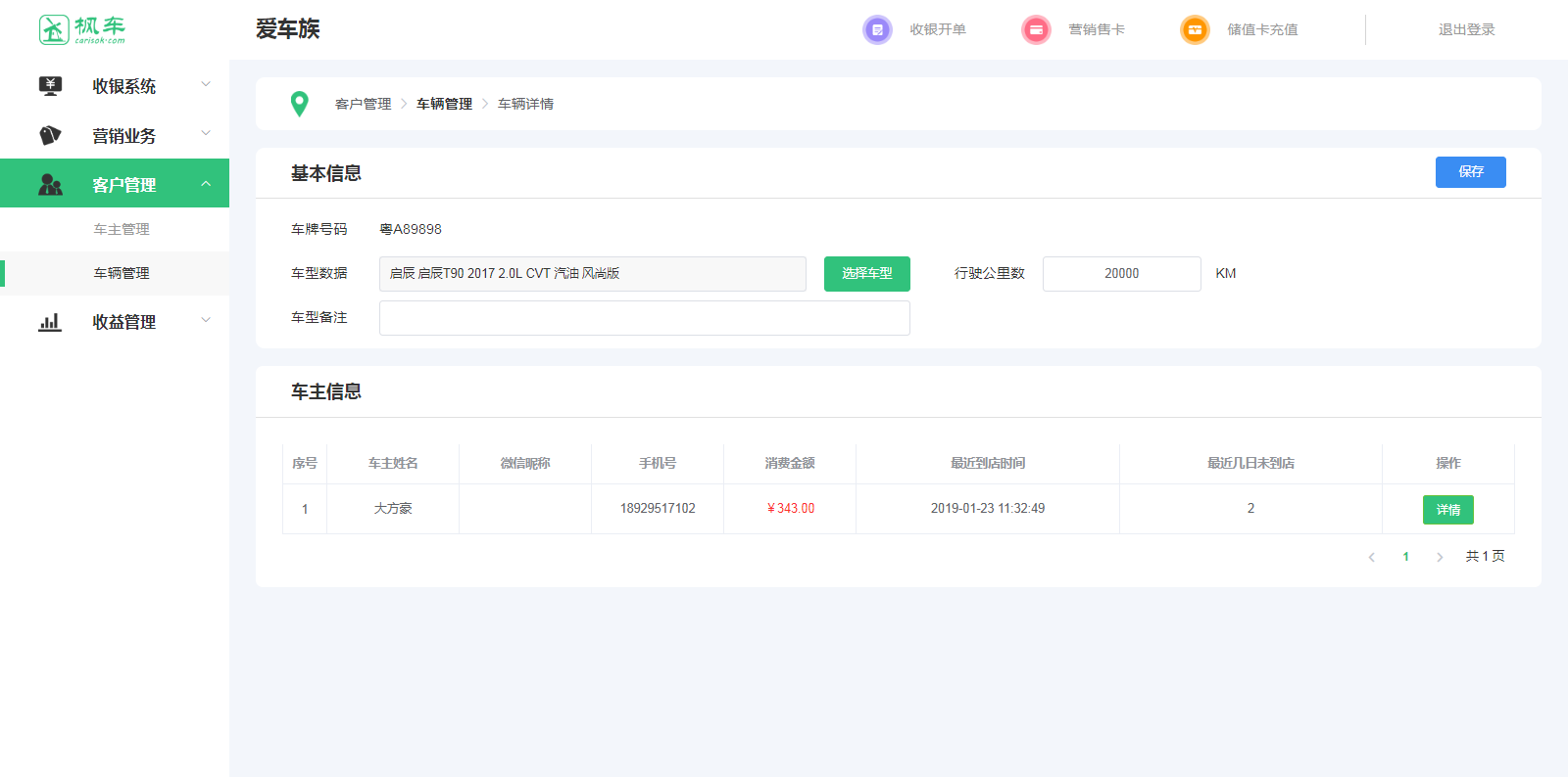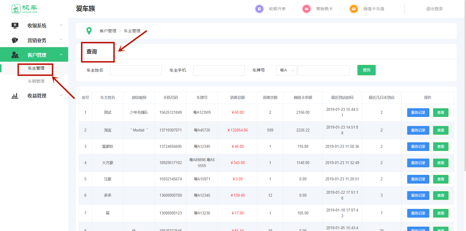 1、在“客戶(hù)管理”中找到“車(chē)主管理”,點(diǎn)擊車(chē)主管理,可查看該車(chē)主的消費總額、消費次數、儲值卡余額。也可直接輸入車(chē)主姓名、手機號和車(chē)牌號進(jìn)行查找查看某一車(chē)主信息。
