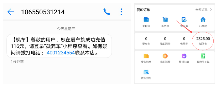 4、充值成功后,車(chē)主將收到一條到賬短信,并在小程序上看到儲值卡余額。