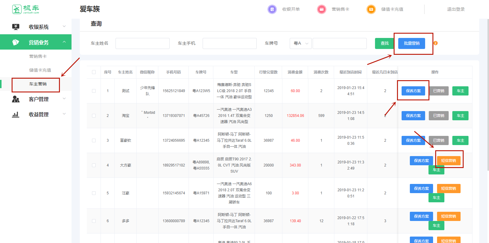 1、在“營(yíng)銷(xiāo)業(yè)務(wù)”中找到“車(chē)主營(yíng)銷(xiāo)”,在車(chē)主營(yíng)銷(xiāo)頁(yè)面可以對單一車(chē)主進(jìn)行短信營(yíng)銷(xiāo),也可批量營(yíng)銷(xiāo)(一個(gè)車(chē)主一天只能營(yíng)銷(xiāo)一次)車(chē)主營(yíng)銷(xiāo)頁(yè)面還可查看該車(chē)的保養方案;該車(chē)主儲值卡消費的總金額;消費次數以及到店時(shí)間和未到店時(shí)間。短信營(yíng)銷(xiāo)后,車(chē)主會(huì )收到一條營(yíng)銷(xiāo)短信。