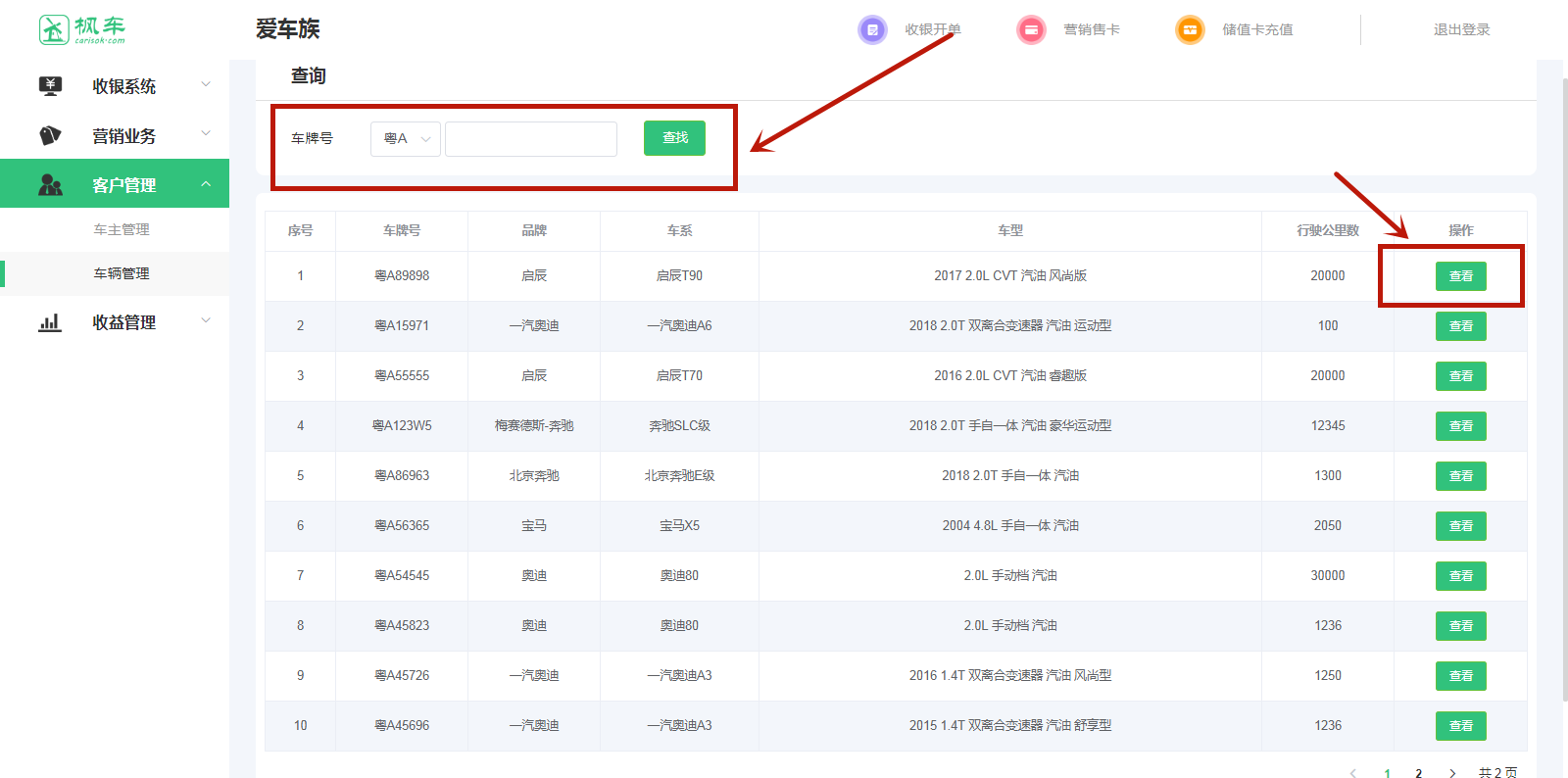 3、在“客戶(hù)管理”中找到“車(chē)輛管理”,可輸入車(chē)牌號直接查詢(xún)車(chē)輛,也可在列表中查找車(chē)輛。點(diǎn)擊查看可直接查看該車(chē)型的數據