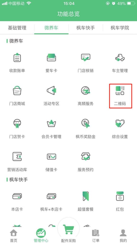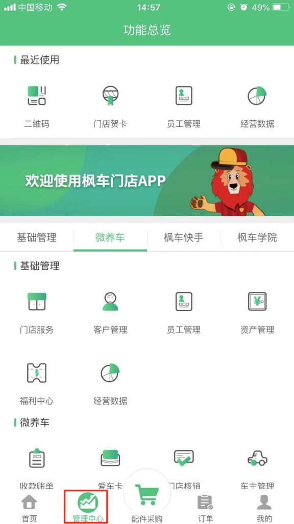 1.打開(kāi)“楓車(chē)門(mén)店”APP,點(diǎn)擊“管理中心”,進(jìn)入到功能總覽頁(yè)面。
