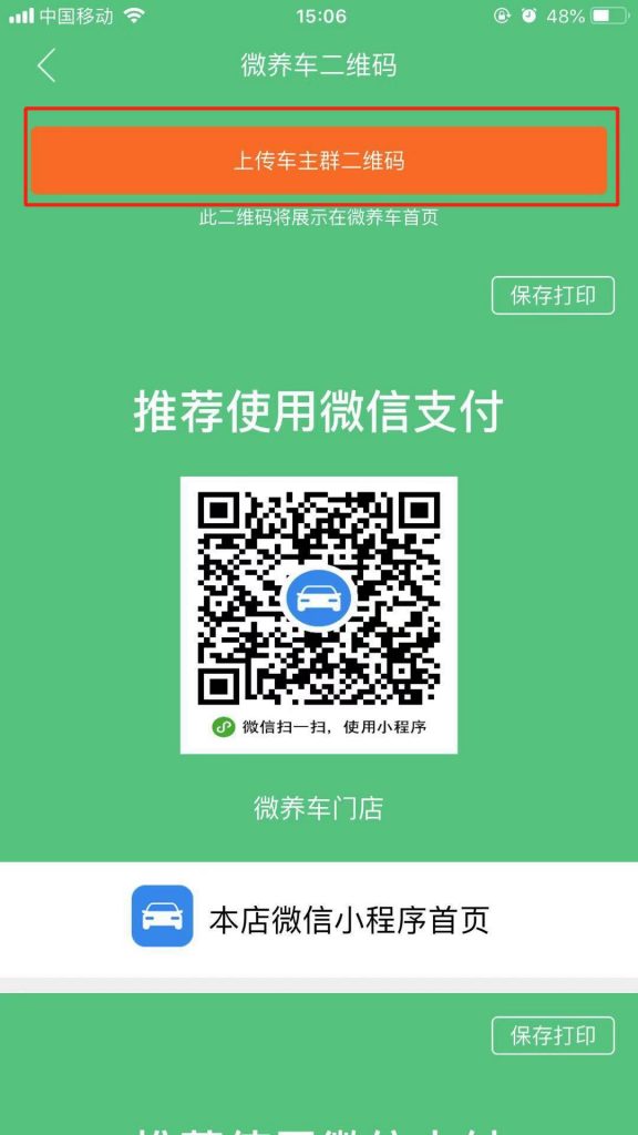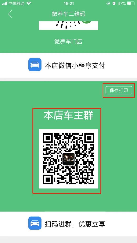 6.保存成功,APP會(huì )自動(dòng)跳轉到“微養車(chē)二維碼”頁(yè)面,上劃頁(yè)面,可以看到“本店車(chē)主群”二維碼,點(diǎn)擊右上角的“保存打印”,會(huì )自動(dòng)下載二維碼圖片到手機。
