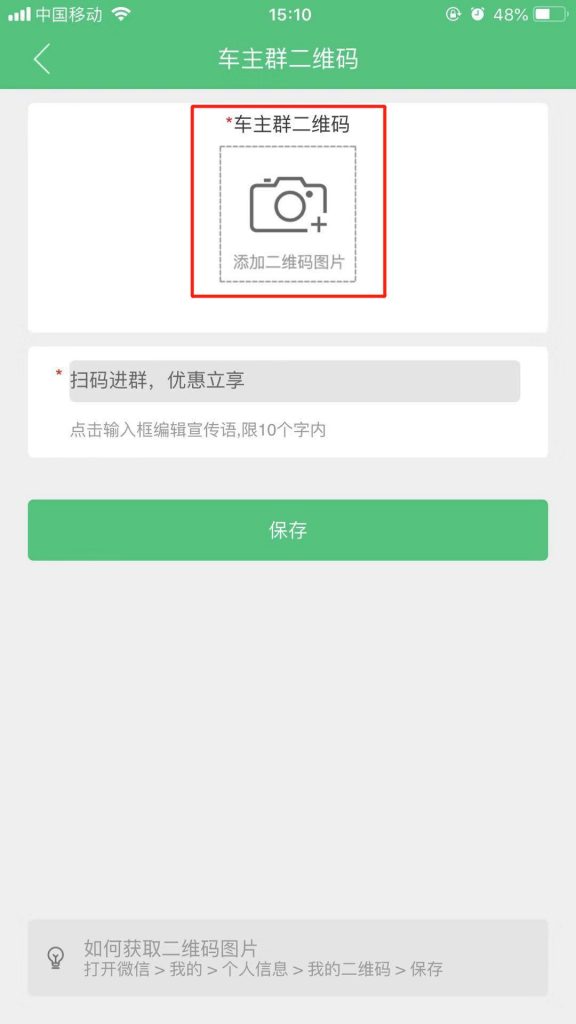 4.進(jìn)入到車(chē)主群二維碼頁(yè)面,點(diǎn)擊“添加二維碼圖片”(注意:這里建議大家上傳門(mén)店運營(yíng)管理者的微信二維碼圖片,待車(chē)主添加微信后,再拉進(jìn)門(mén)店車(chē)主群)。