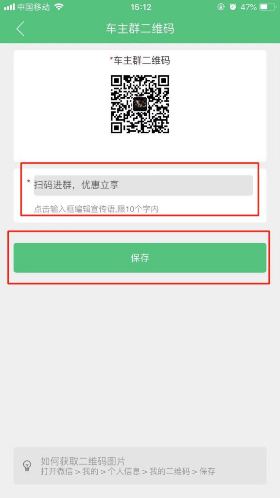 5.選擇要上傳的二維碼圖片,上傳完成可以編輯宣傳語(yǔ),也可以直接使用微養車(chē)團隊編輯好的宣傳語(yǔ),然后點(diǎn)擊保存。