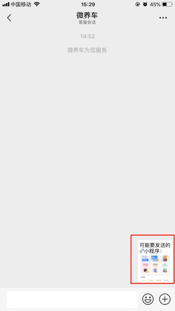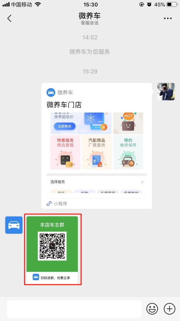 2.在“微養車(chē)客服會(huì )話(huà)”頁(yè)面,點(diǎn)擊右下角“可能要發(fā)送的小程序”,發(fā)送成功,就會(huì )收到“本店車(chē)主群”二維碼圖片。