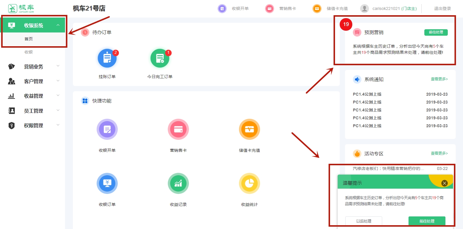1、進(jìn)入楓車(chē)門(mén)店電腦版,點(diǎn)擊“收銀系統”—“首頁(yè)”,在頁(yè)面的右上角可看到“預測營(yíng)銷(xiāo)”以及車(chē)主營(yíng)銷(xiāo)提示。