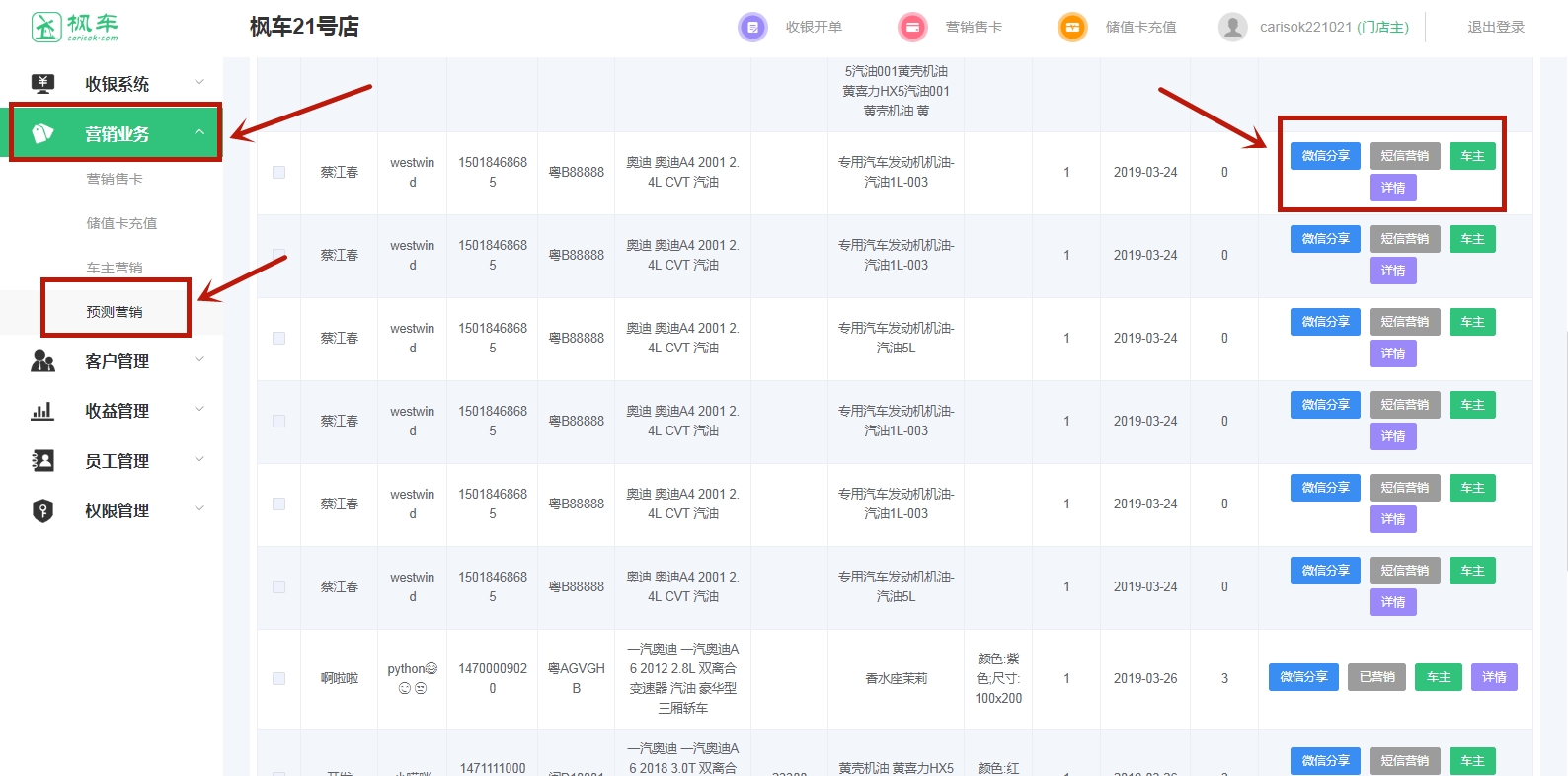 2、點(diǎn)擊“前往處理”,將跳轉到“營(yíng)銷(xiāo)業(yè)務(wù)”板塊下的“預測營(yíng)銷(xiāo)”功能,在這個(gè)界面可看到楓車(chē)大數據預測的需求,顯示車(chē)主潛在的消費需求,再通過(guò)短信營(yíng)銷(xiāo)或者微信分享,把商品推送給車(chē)主。