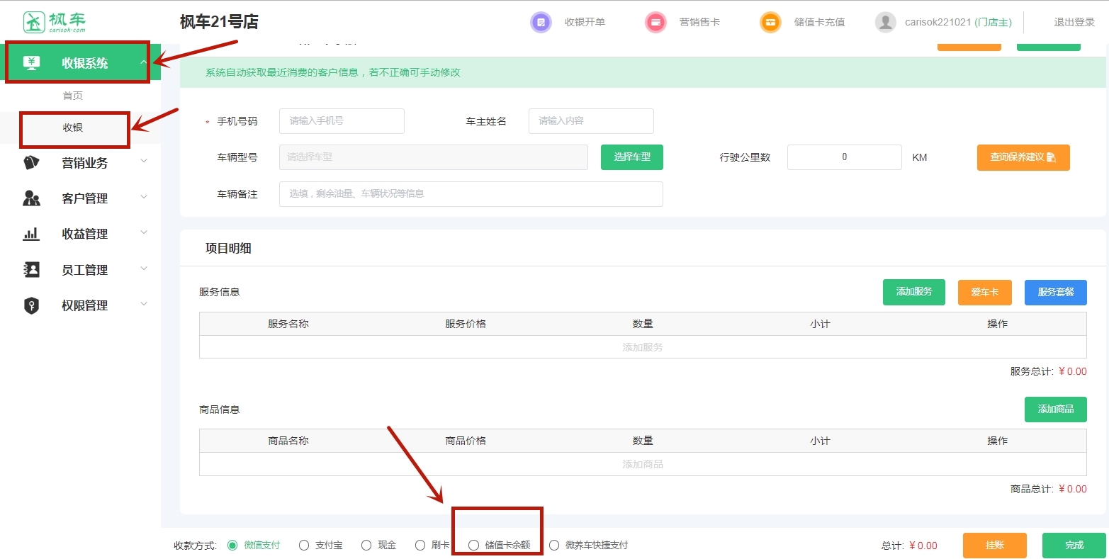 3、進(jìn)入“收銀系統”—“收銀”頁(yè)面,在底部 “收款方式”可選擇“儲值卡余額”支付。