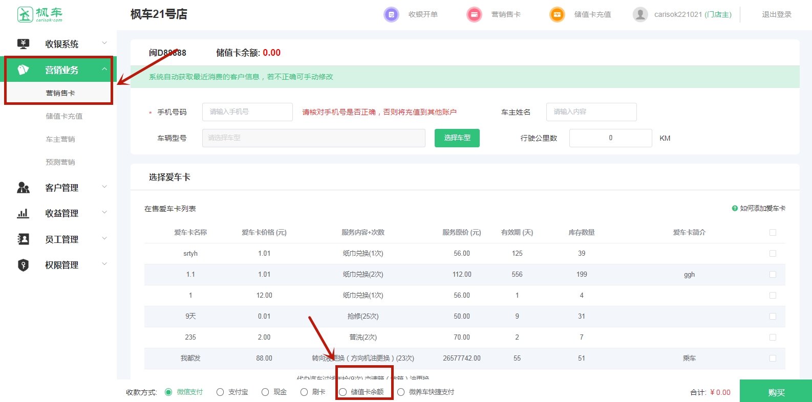 4、進(jìn)入“營(yíng)銷(xiāo)業(yè)務(wù)”—“營(yíng)銷(xiāo)售卡”頁(yè)面,在底部 “收款方式”可選擇“儲值卡余額”支付。