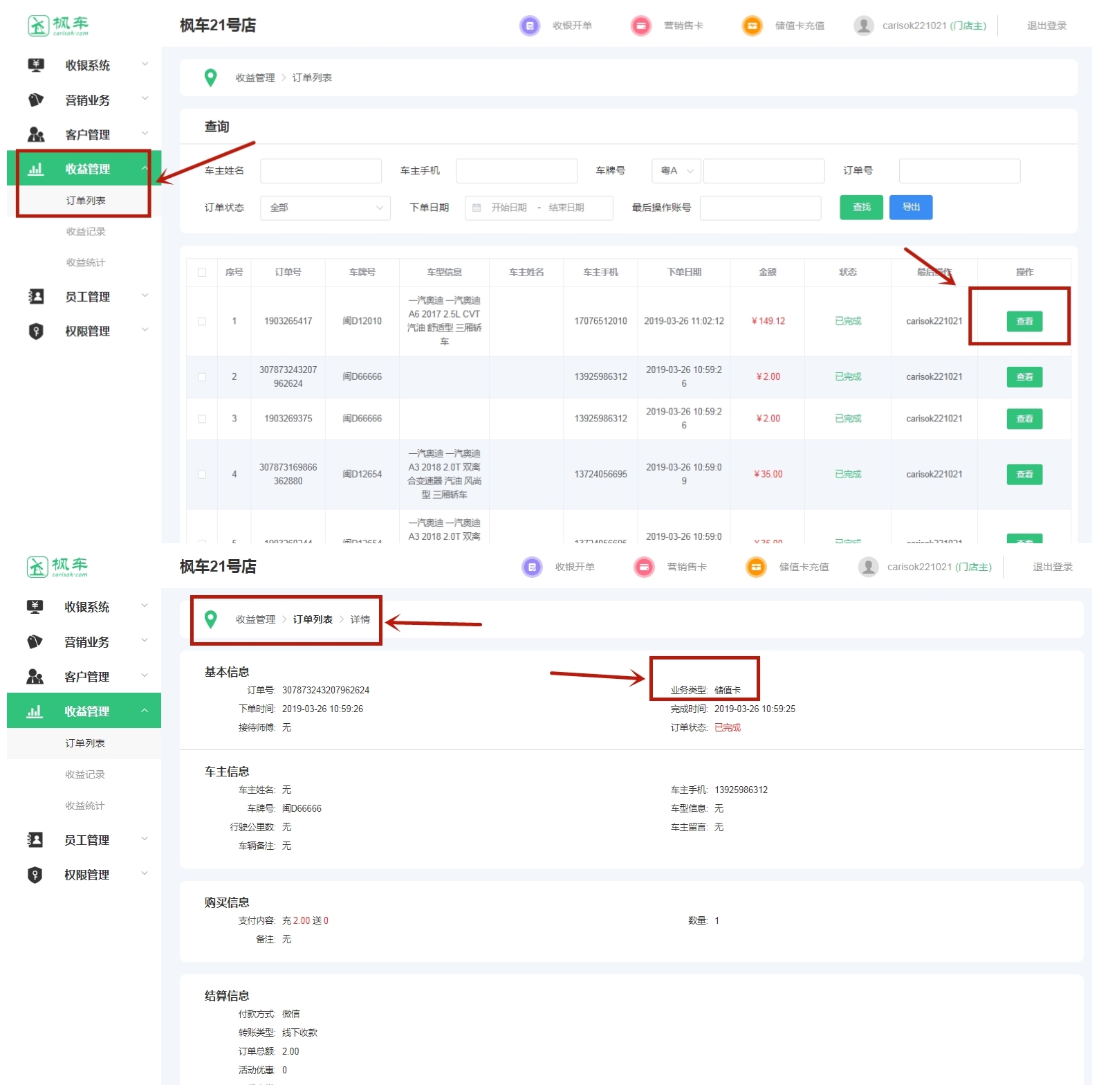 5、點(diǎn)擊“收益管理”—“訂單列表”,再點(diǎn)擊“查看”,訂單業(yè)務(wù)類(lèi)型可顯示儲值卡支付。