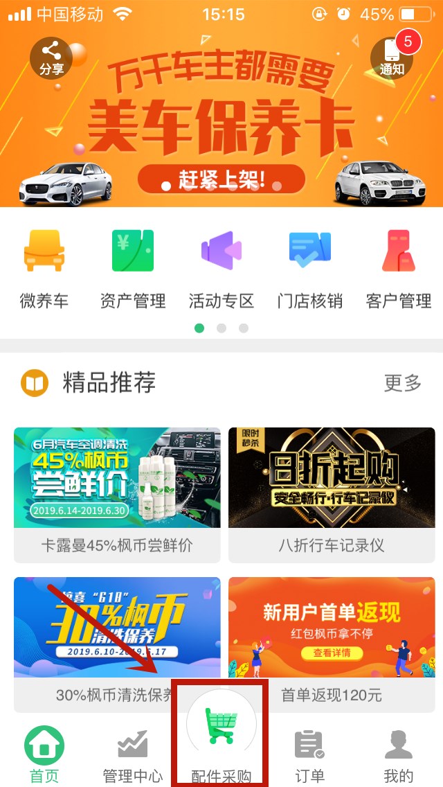 1、打開(kāi)楓車(chē)門(mén)店App,點(diǎn)擊“配件采購”