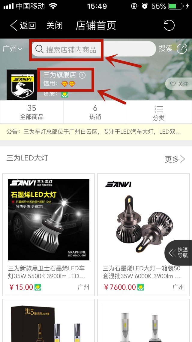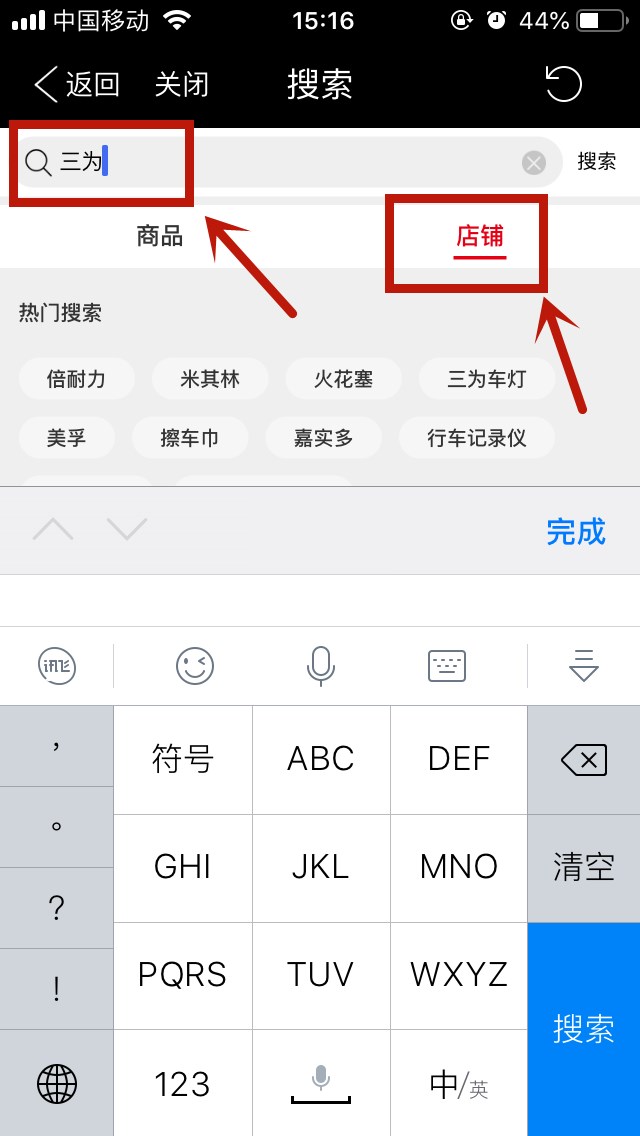 3、選擇“店鋪”,輸入“三為”進(jìn)行搜索