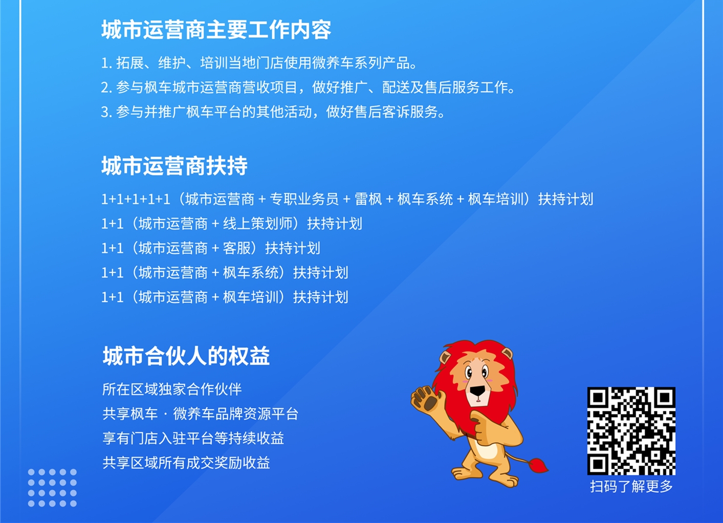 加盟優(yōu)秀的平臺就是創(chuàng )業(yè)成功的一半,楓車(chē)城市運營(yíng)商正是你所需要尋找的那個(gè)合作伙伴。
