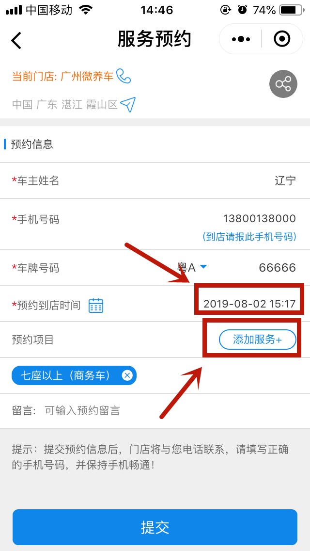 2、填寫(xiě)預約表單,選擇到店時(shí)間和服務(wù),提交表單即可完成車(chē)主預約操作。