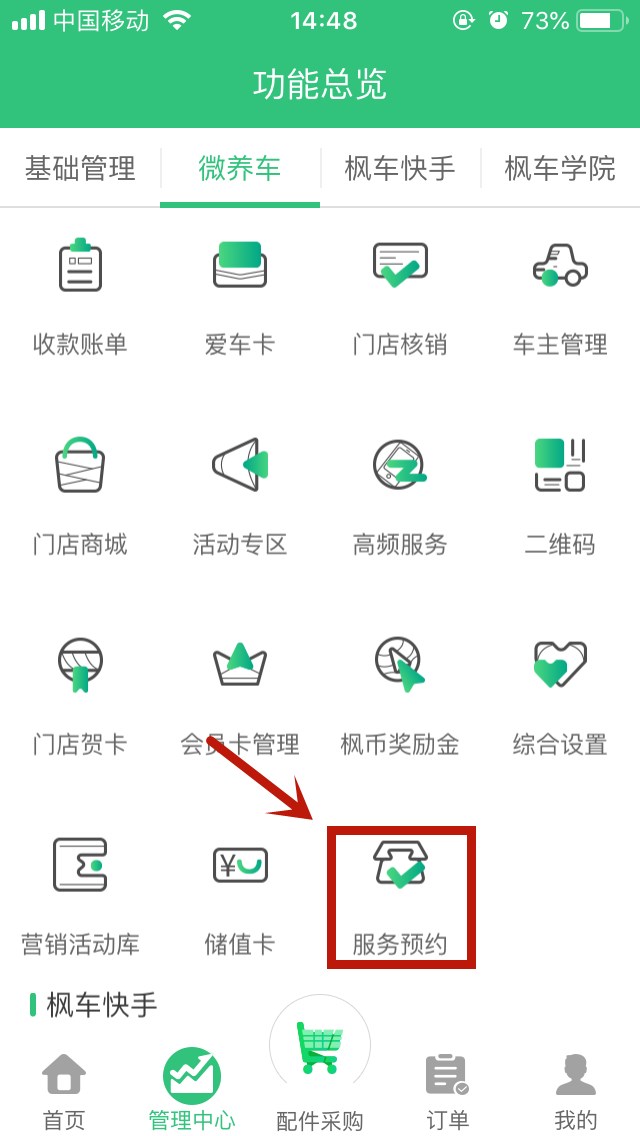 1、打開(kāi)“楓車(chē)門(mén)店”App,點(diǎn)擊“管理中心”—“微養車(chē)”—“服務(wù)預約”