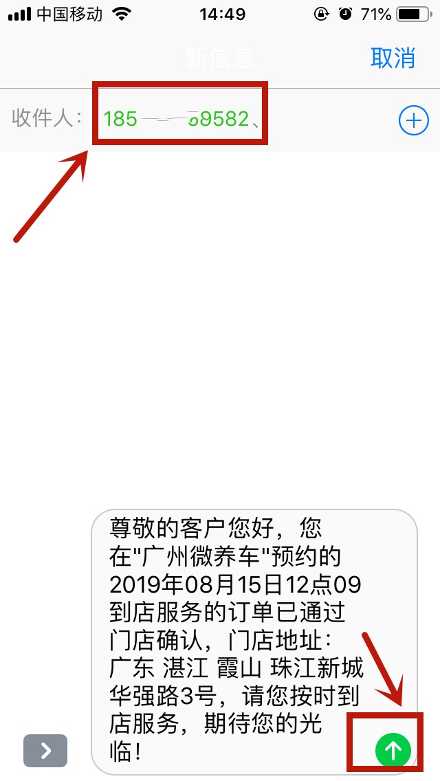 5、自動(dòng)跳轉到短信發(fā)布頁(yè)面,點(diǎn)擊發(fā)送按鈕,即可完成門(mén)店確認的操作。