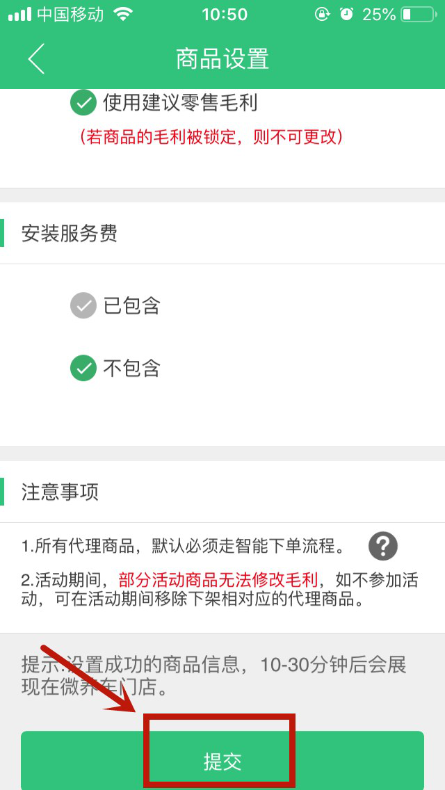5、填寫(xiě)商品設置,包括“商品毛利”、“安裝服務(wù)費”,提交即可完成代理上架,10-30分鐘后可在微養車(chē)小程序上可查看。車(chē)主在微養車(chē)小程序直接選購即可。
