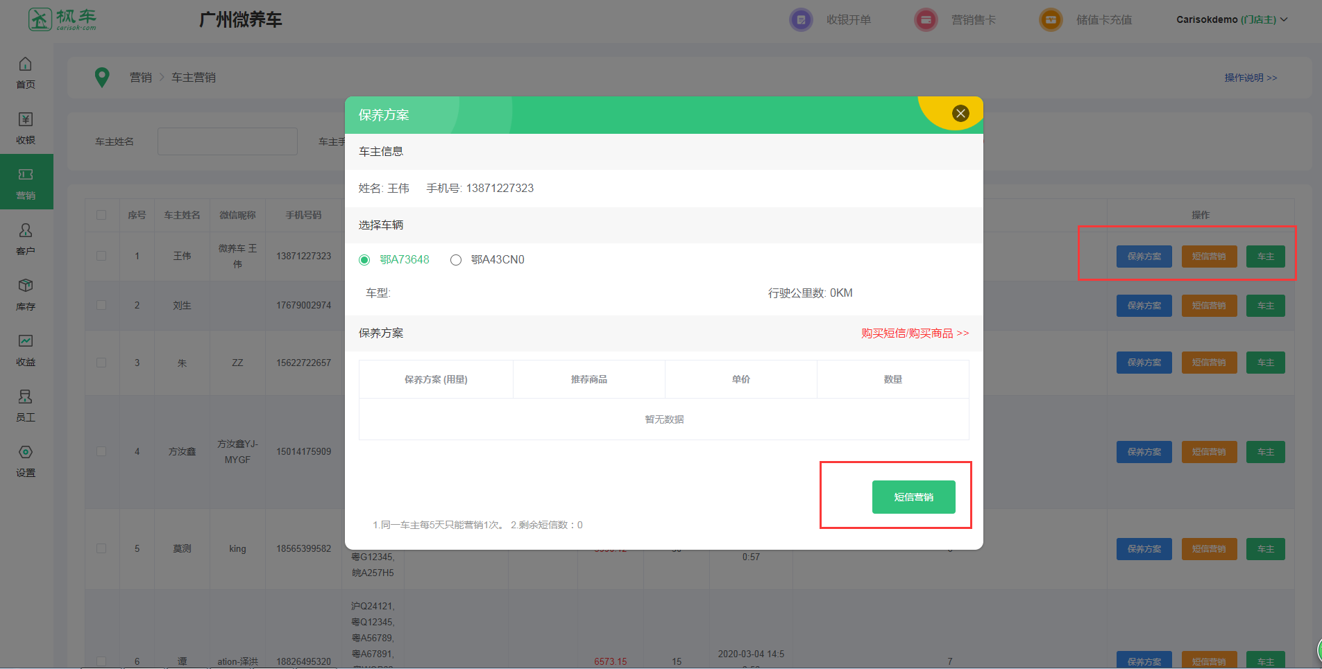 三、點(diǎn)擊保養方案可短信營(yíng)銷(xiāo)保養時(shí)間已到的車(chē)主。
