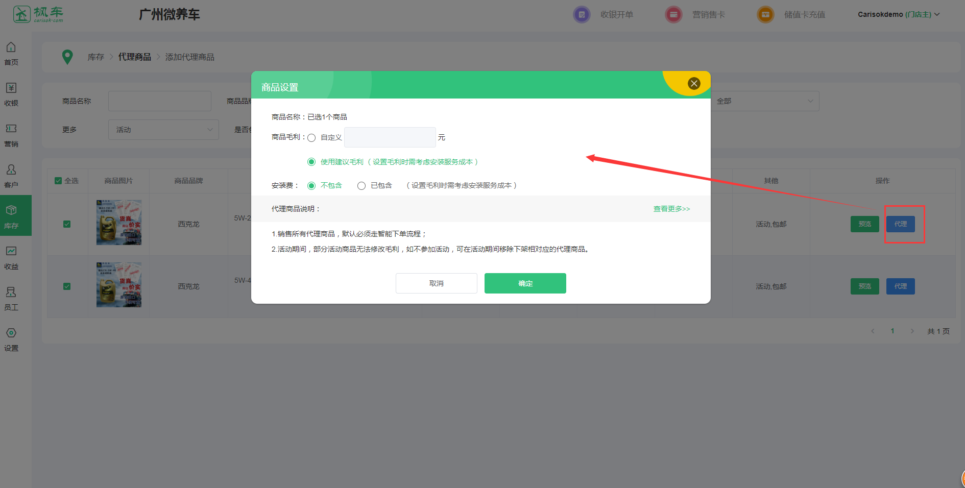4、點(diǎn)擊代理可自定義商品毛利,設置完成確定即代理成功。