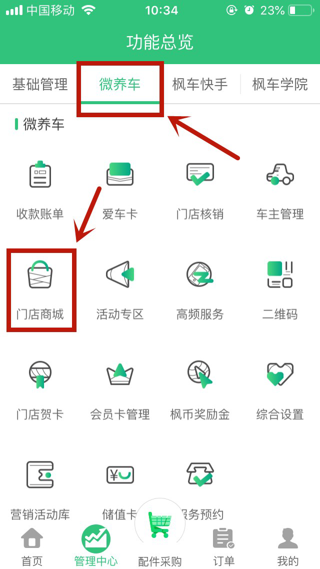 2、點(diǎn)擊“微養車(chē)”,再點(diǎn)擊“門(mén)店商城”