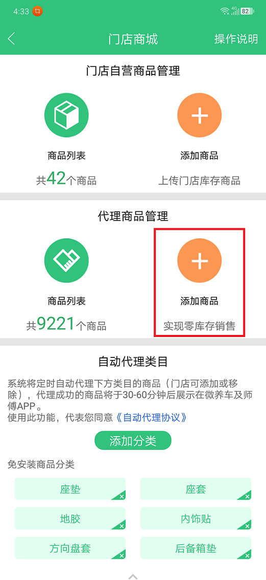 3、進(jìn)入“門(mén)店商城”頁(yè)面,點(diǎn)擊代理商品管理“添加商品”