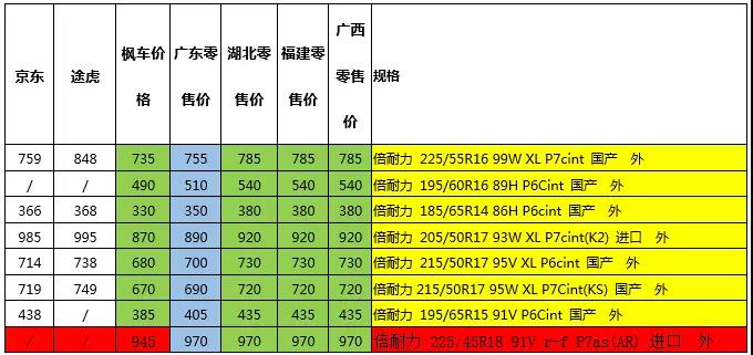 參與活動(dòng)的輪胎型號價(jià)格對比