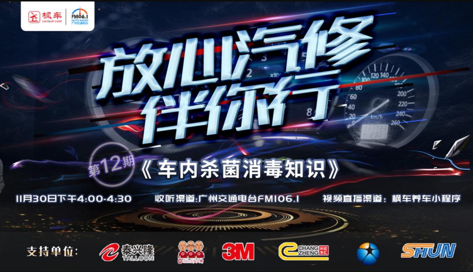 因與廣州國際車(chē)展活動(dòng)時(shí)間沖突而延播的第十二期《放心汽修伴你行》電臺節目終于準備開(kāi)播了!11月30日(周一)下午4:00-5:00,準點(diǎn)蹲FM106.1廣州交通電臺,即可在線(xiàn)收聽(tīng)熟悉的聲音,實(shí)用的養車(chē)資訊!